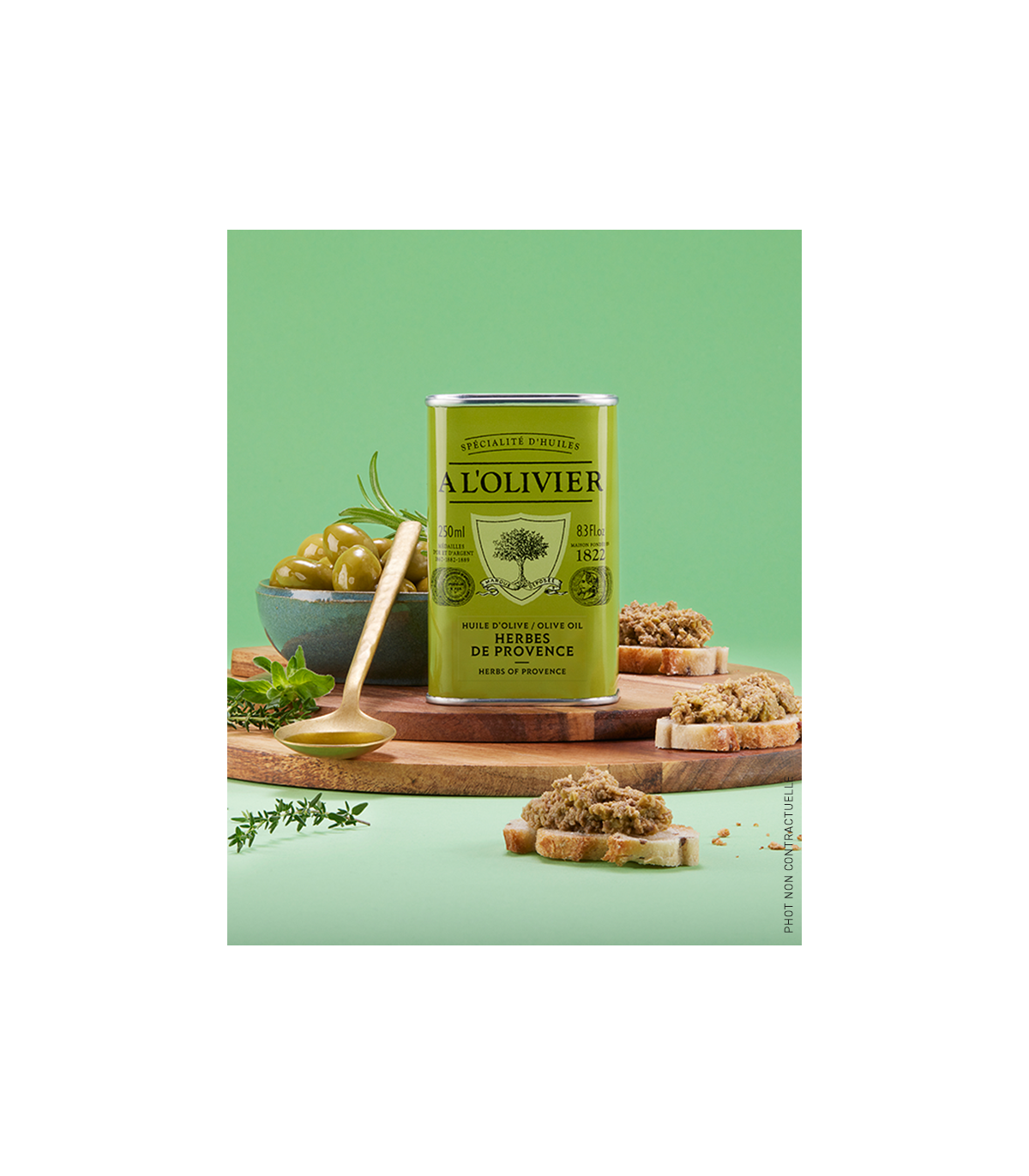 - Huile d’olive vierge extra 60%, huile d'olive infusée herbes de Provence [huile d'olive vierge extra 32,2%, herbes de Provence 7,9% (thym, origan, romarin)].